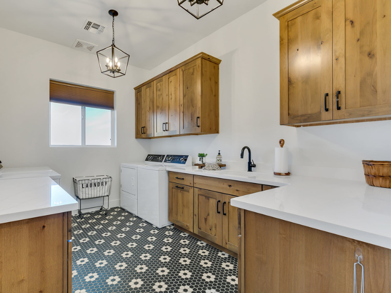 This brings warmth to this laundry space, featuring white quartz countertops, matte black hardware, and a patterned encaustic tile floor.