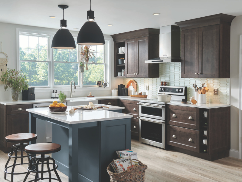 Diamond Distinction's Destination door in a rich Espresso-stained Maple pairs with a Slate Blue painted island.