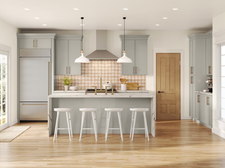 Sage Mist shakers with a matching island, patterned Moroccan tile backsplash, and a Natural wood pantry door accent.