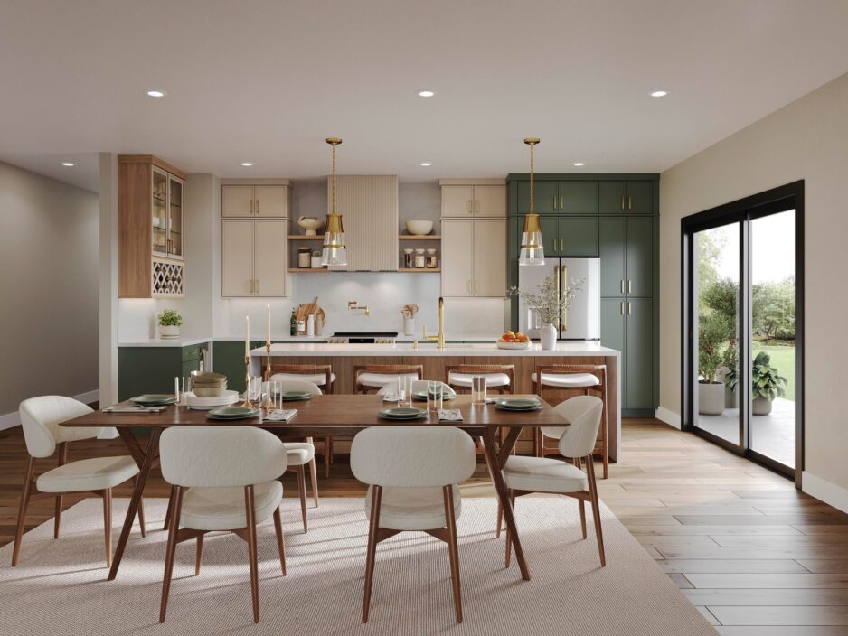 Warm Cognac-stained shakers with glass-front display uppers, a reclaimed wood dining table and a sputnik brass pendant.