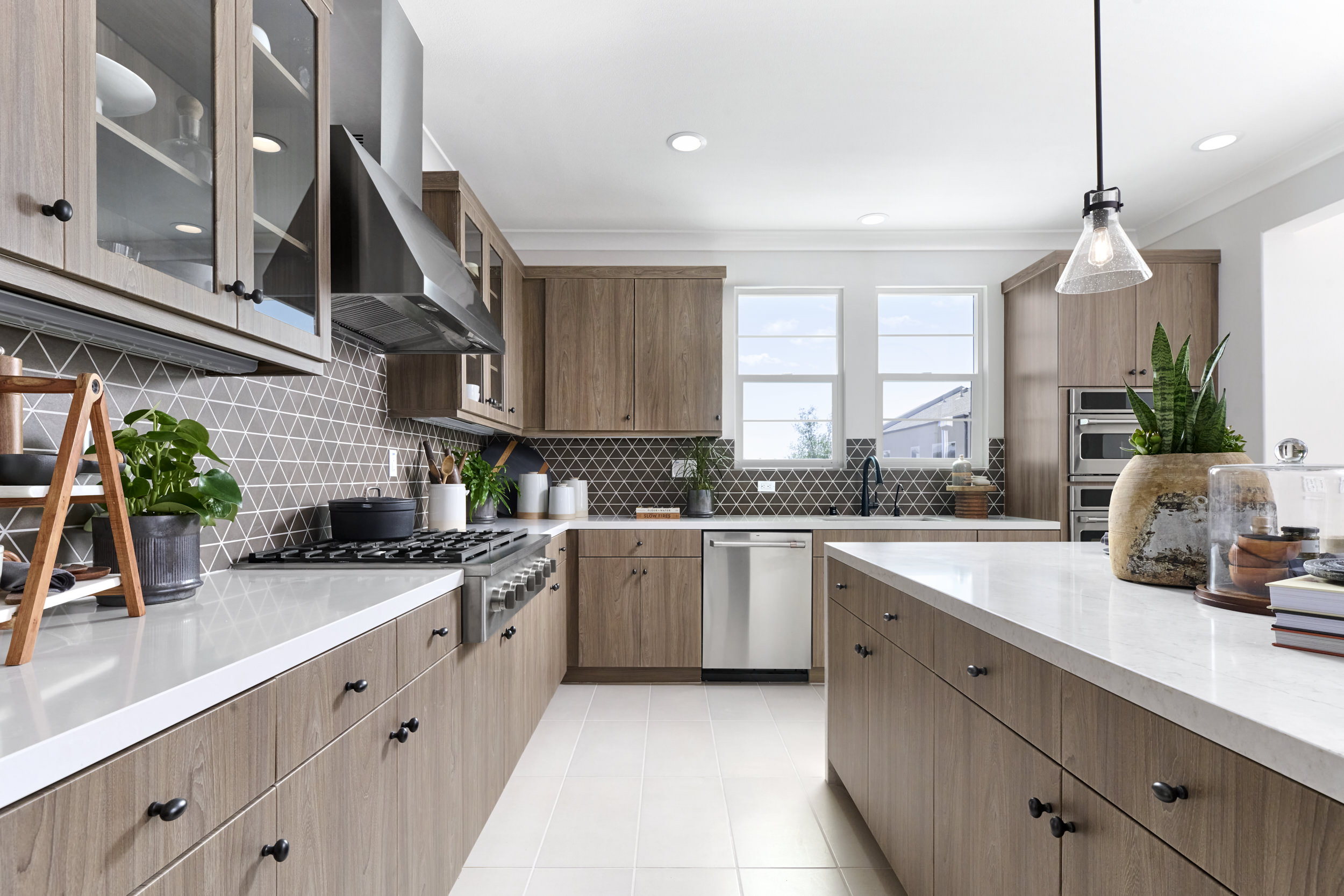Rift-cut Natural Walnut slab doors with matte black hardware and a bold geometric tile backsplash.
