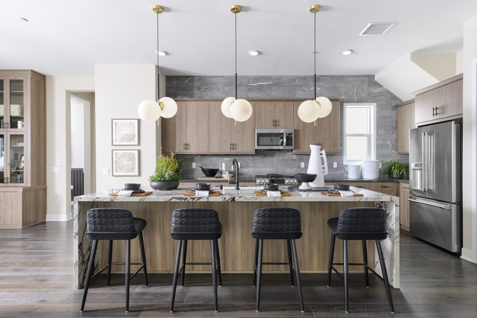 With a waterfall quartz island, open shelving and seamless living room integration.