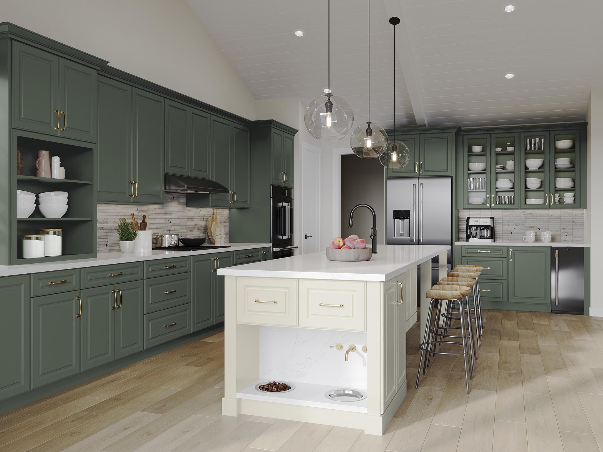 Deep Forest Green full-overlay shakers with brass hardware surround a painted Cream furniture-style island with pet nook.