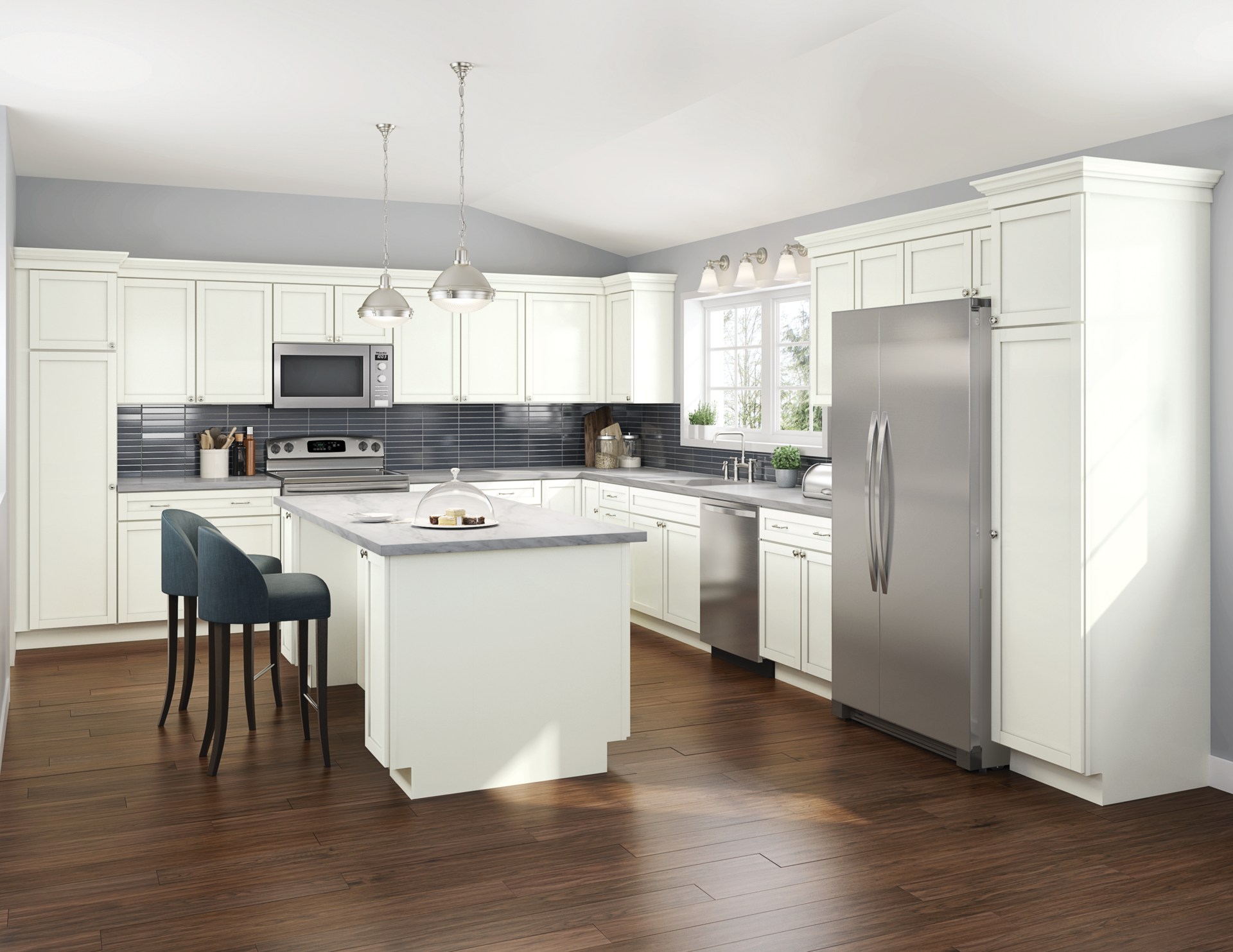 Crisp Cotton shakers with a Graphite painted island, black pendant lighting and a charcoal tile backsplash in a vaulted open-concept layout.
