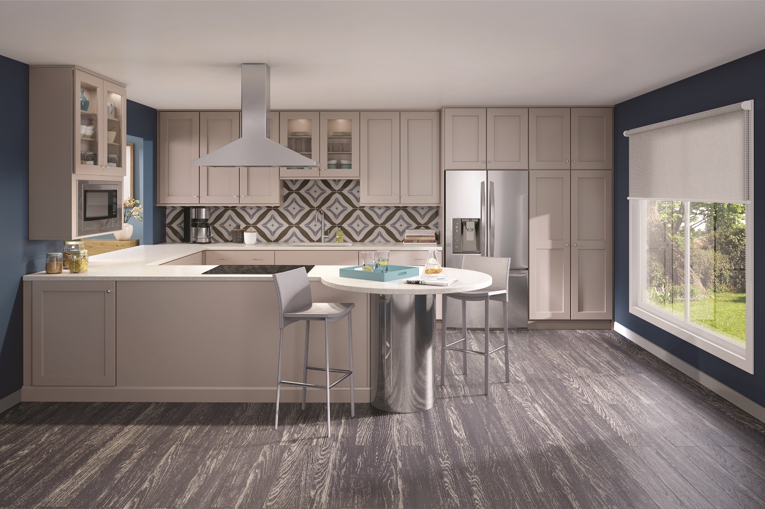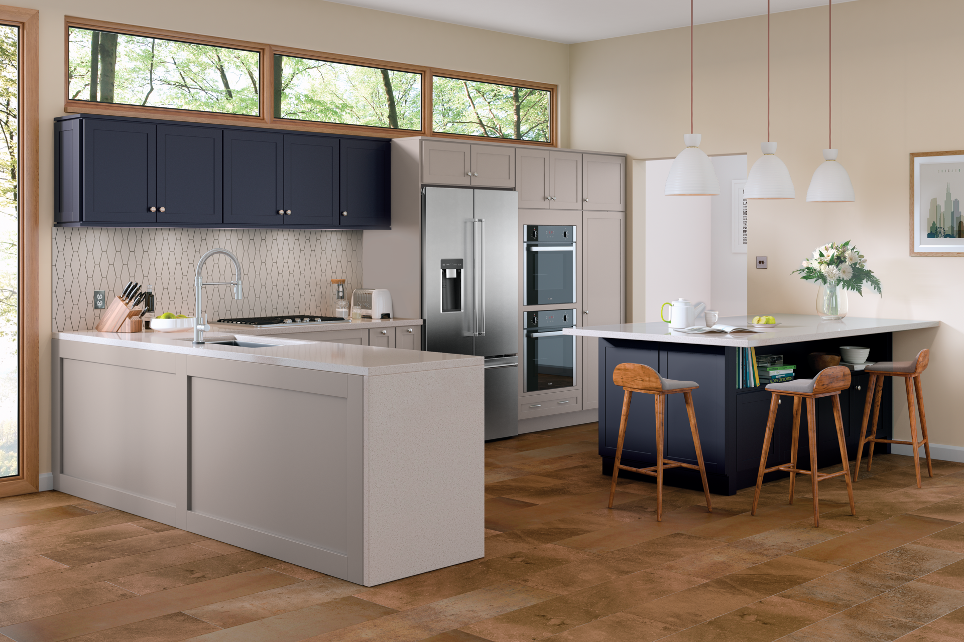Full-overlay lowers contrast bold Navy upper cabinets above a herringbone-pattern tile backsplash and white quartz island.