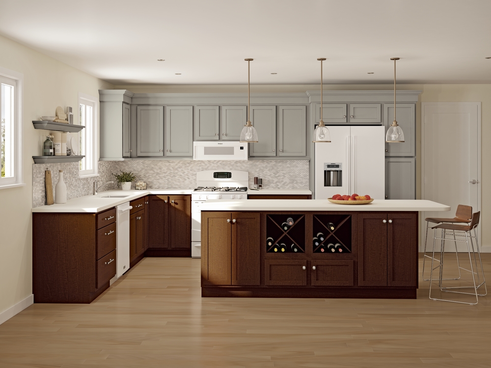 Peterson uppers contrast a deep Espresso island with integrated wine lattice and brushed gold hardware.