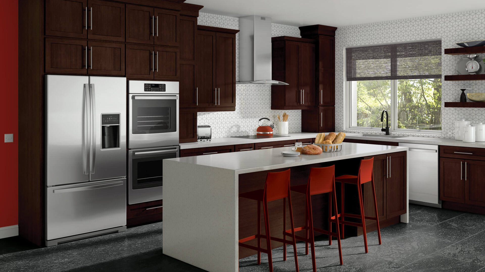 Deep Bordeaux-stained Baldwin raised-panel cabinetry with a white quartz island, crown molding detail and bold red barstools.