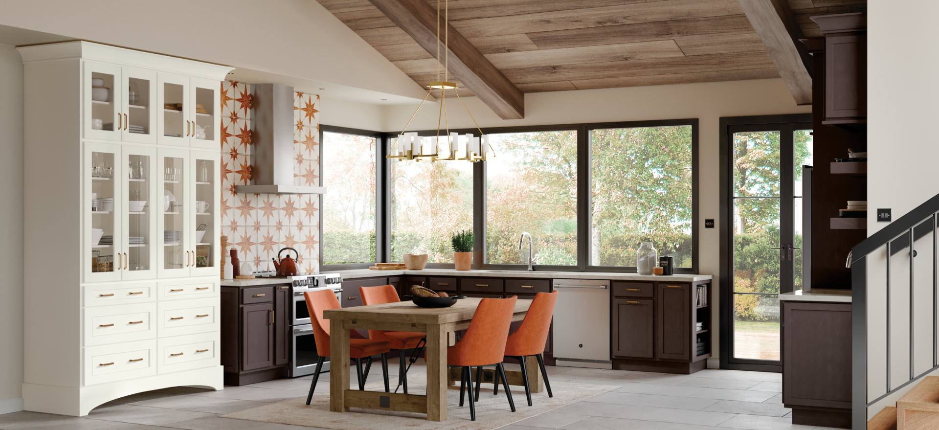 Rich Espresso-stained Baldwin doors with a wood-plank ceiling, open dining integration and a bold starburst tile backsplash.