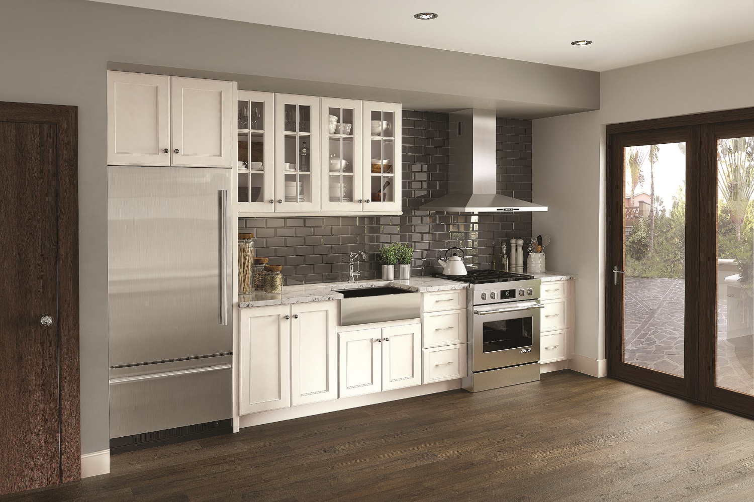 With a farmhouse apron sink, glass-front uppers and dark subway tile in a compact galley layout.