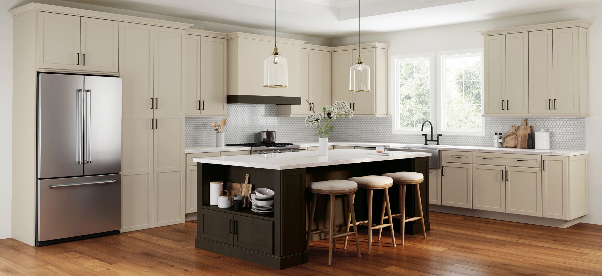 Tobin shakers with a Graphite open-shelf island, hex tile backsplash and glass cylinder pendants.