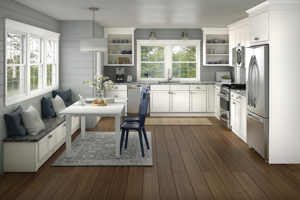 Kittery shakers with a window-side built-in banquette, open display uppers and a shiplap accent wall.