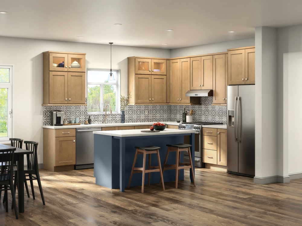 Quality Cabinets' Tobin shaker door in Cotton paint pairs with a Natural Maple stained island, brushed gold hardware and a quartz perimeter countertop.